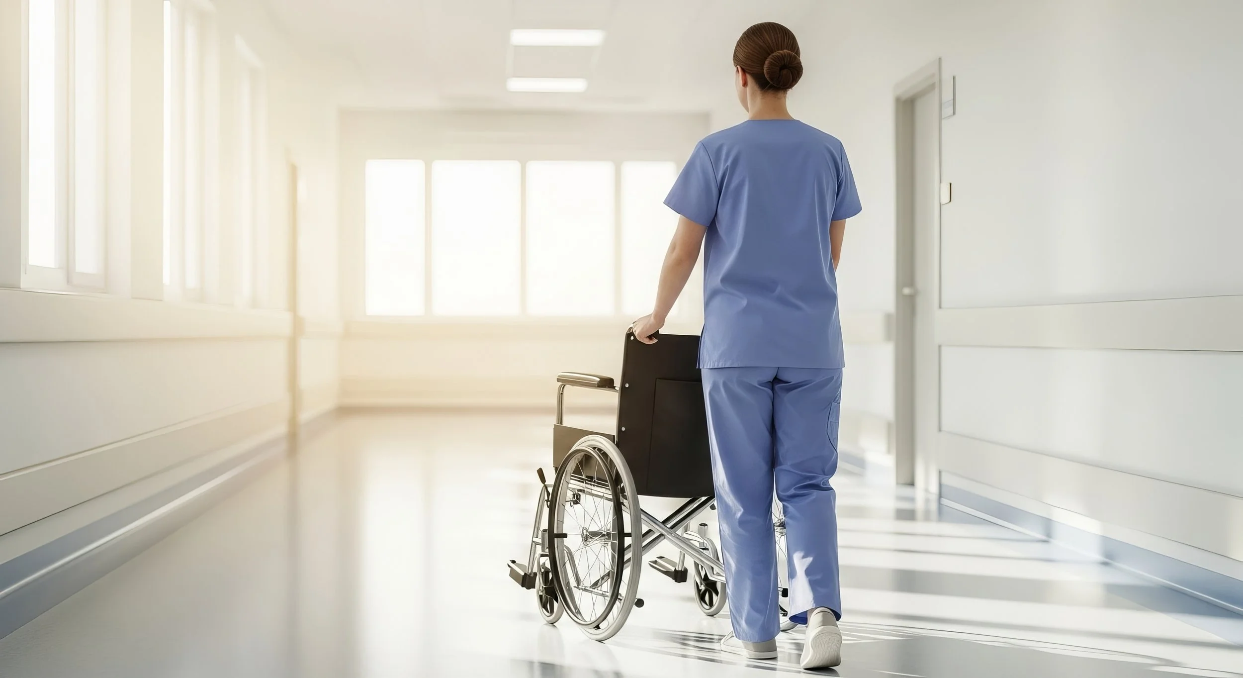 A healthcare worker in blue scrubs walking down a hospital hallway pushing a wheelchair.